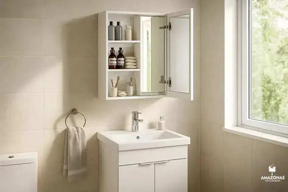 Esses armários podem conter portas com espelho que se abrem para revelar prateleiras internas, ideais para guardar produtos de higiene pessoal, cosméticos e medicamentos. Há também versões com iluminação embutida, que melhoram a visibilidade e agregam valor estético ao móvel.